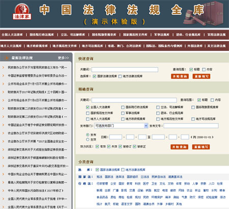 中国法律法规全库——数据精确、分类科学、更新及时、检索方便,内含丰富的法律信息文件,拥有强大的检索功能和快捷的法规详情页面打印功能。
